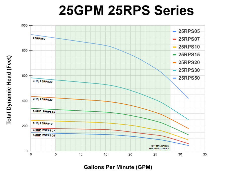 25RPS series pumps are designed for flow applications of 31 GPM or under. They can be self-installed or placed using a local installer. At 150 feet of head the 25RPS10 will pump 27 GPM! 1.25" FNPT Outlet.