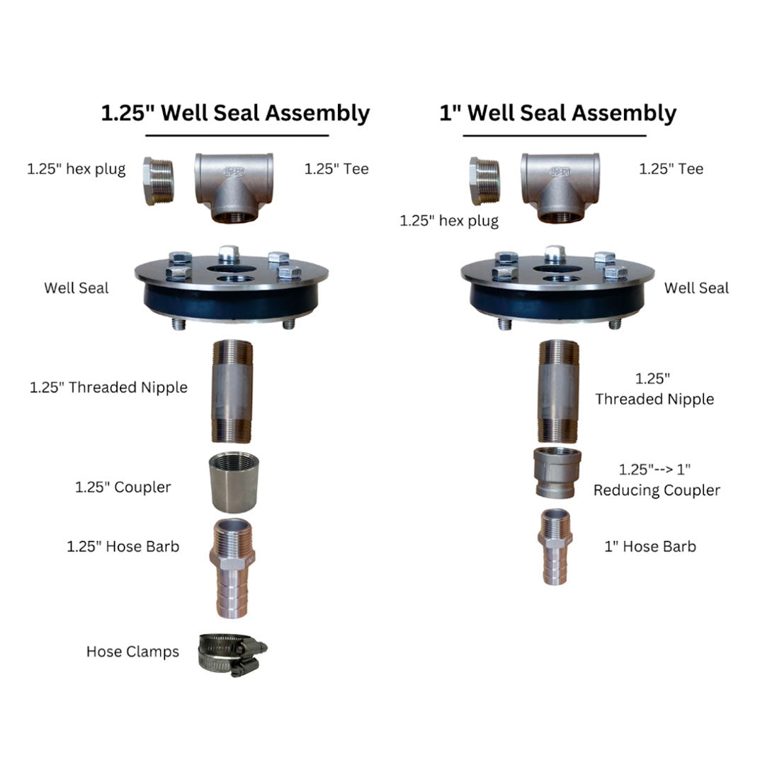 Available with 1" for 1 1/4" Stainless Barbed insert down hole for Poly Pipe Connections. Plumbing through well seal is 1.25". Threaded Tee / Elbow outlet is 1.25". Easy to neck down or bump up to larger diameters for above ground piping.